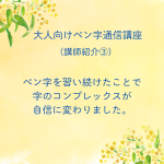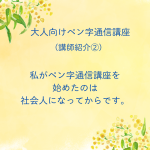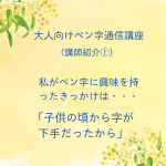 2026年2月4日 / 最終更新日時 : 2026年2月3日 youu ◆自己紹介 ペン字通信講座 講師紹介② こんにちは(^_^)大人向けペン字通信講座/葉雨ペン字通信レッスンです。 私がペン字をきちんと習い始めたのは社会人になってからです。 子供の頃、親から 「書道を習ってみたら?」 とすすめられましたがかたくなに拒否していま […]