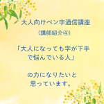 2026年2月6日 / 最終更新日時 : 2026年2月3日 youu ◆自己紹介 ペン字通信講座 講師紹介④ こんにちは(^_^)大人向けペン字通信講座/葉雨ペン字通信レッスンです。 ペン字を教え始めたころは自分はどういう人の力になりたいのか はっきりと分かりませんでした。 ですがあるとき、生徒さんの一人から 「大人になっても小 […]