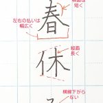 2026年3月17日 / 最終更新日時 : 2026年3月16日 youu *書き方動画 ペン習字 「春休み」の書き方 こんにちは(^_^)大人向けペン字通信講座/葉雨ペン字通信レッスンです。 学生の方は春休みの時期ですね。 今日は「春休み」の書き方です。 コツは、 【春】・・・横画3本は短めに書き、左右の払いは幅広く書く【休】・・・「木 […]