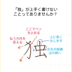 2025年9月26日 / 最終更新日時 : 2025年9月21日 youu ペン字動画 ペン習字 「独」の上手な書き方 こんにちは(^_^)大人向けペン字通信講座/葉雨ペン字通信レッスンです。 今日は「独」の書き方です。 「けものへん」も「虫」も難しいですよね(^_^;) コツは、 ・「けものへん」の二つの払いは方向を変える・「虫」の […]